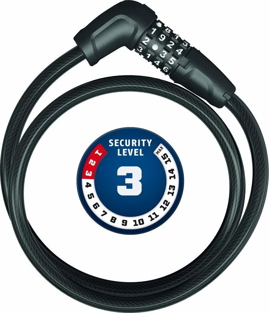 10 mm starkes Stahlkabel, Kunststoffummantelung zum Schutz vor Lackschäden, 2-Komponenten-Zahlenwalzen gewährleisten dauerhafte Lesbarkeit der Ziffern, Zahlencode individuell einstellbar.