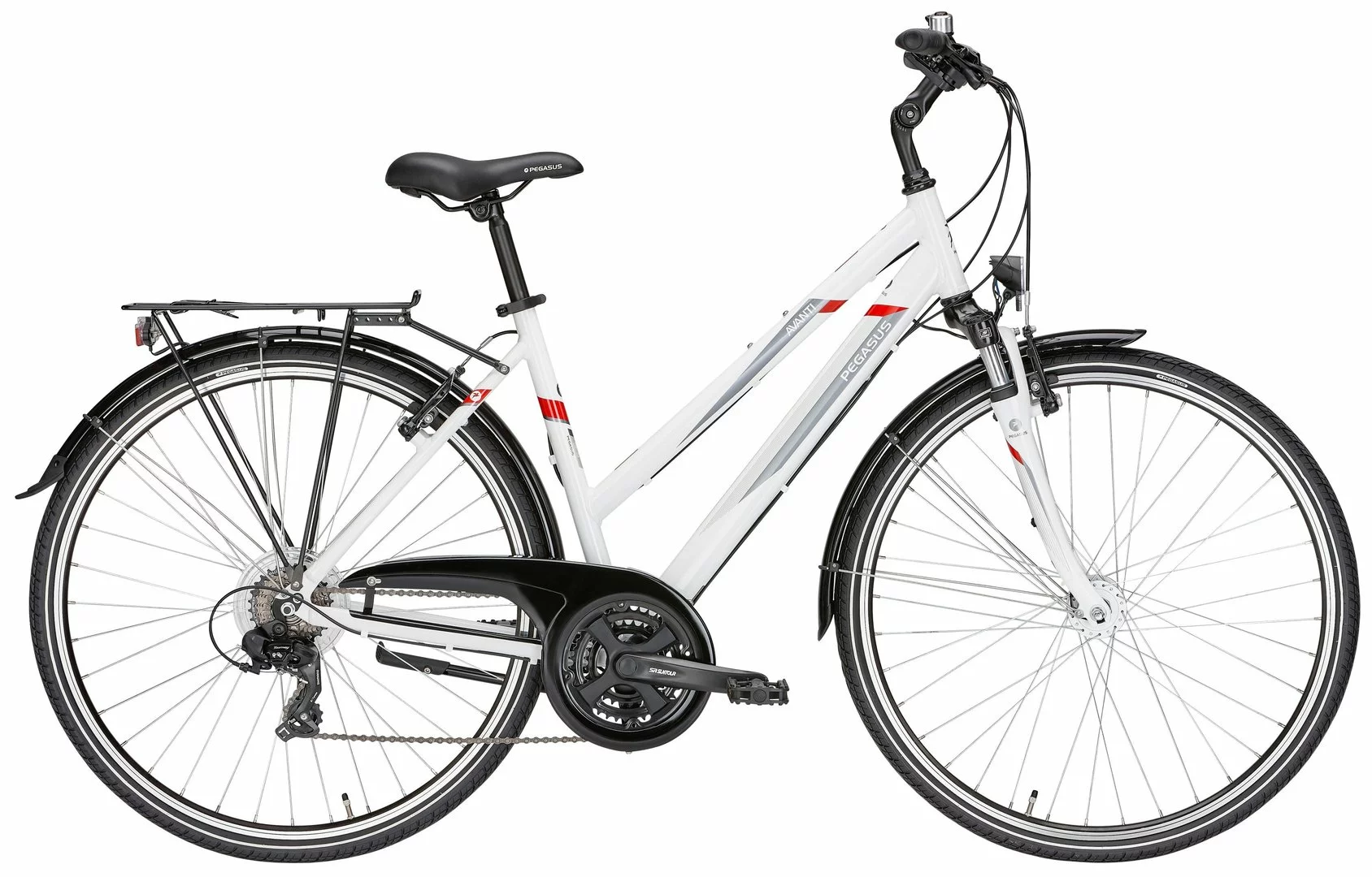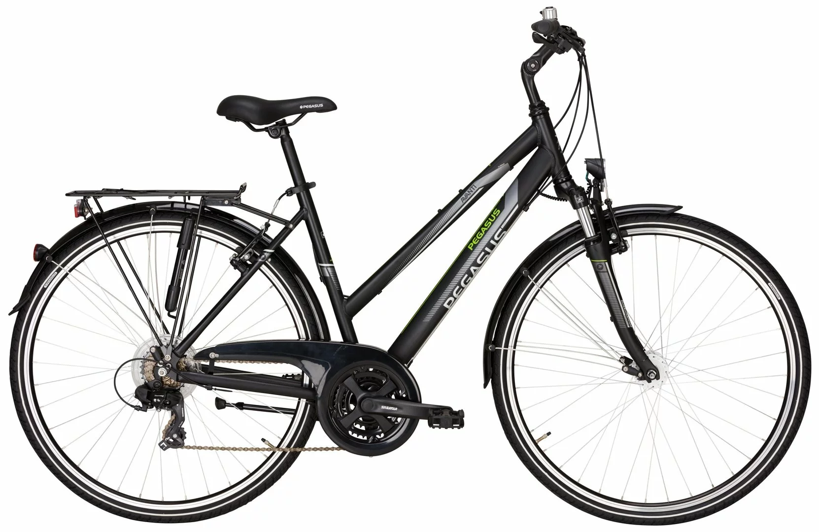 Alu Rahmen, Suntour CR-100 Federgabel, Shimano Tourney 21-Gang Schaltwerk und Umwerfer, Suntour Kurbeln mit gekapseltem Lager, Altus EZ-Fire Schalthebel, Alu V-Bremsen, Hohlkammer-Felgen, verstellbarer Vorbau, Nabendynamo, 15 Lux LED-Lampe, Standrücklicht