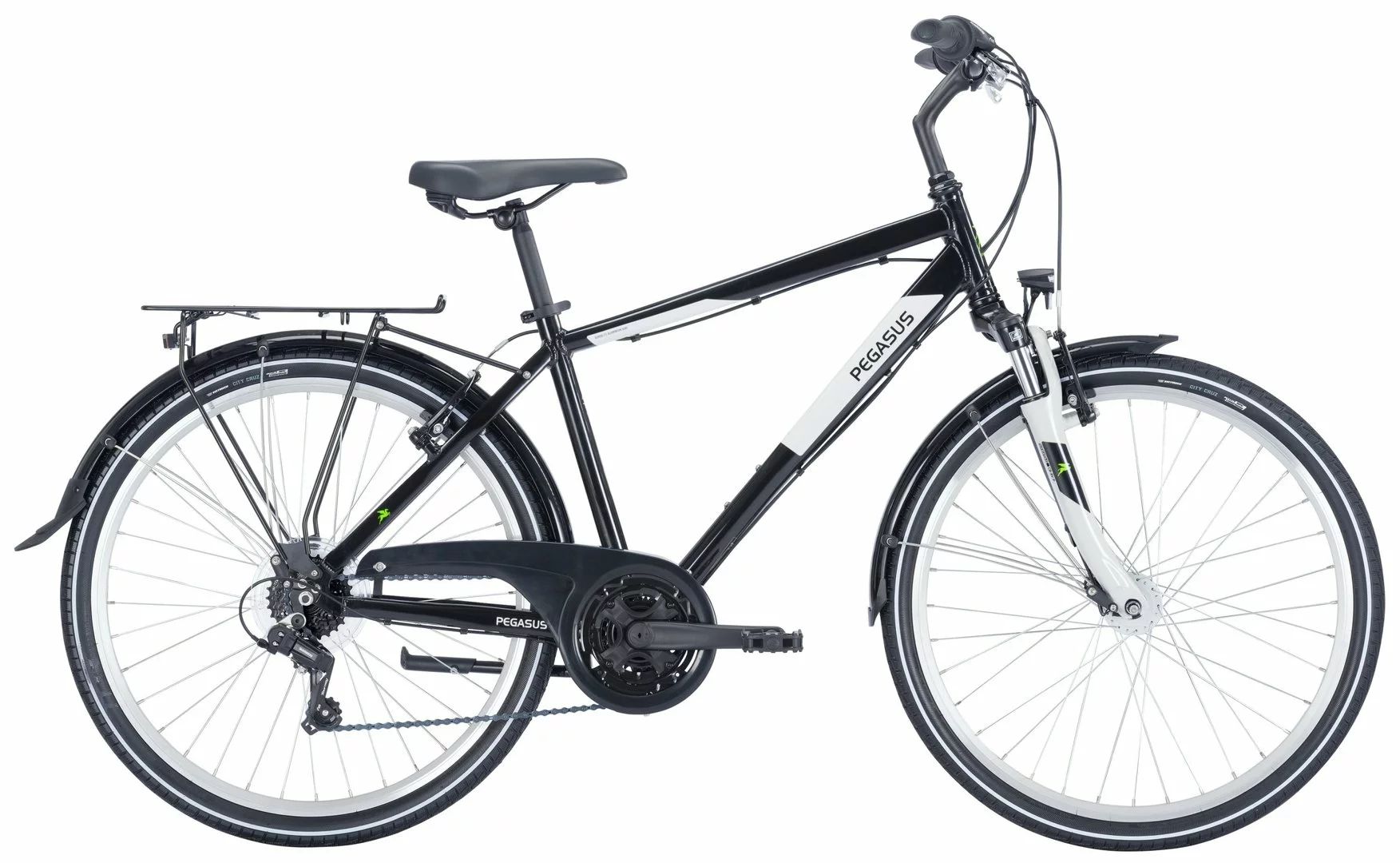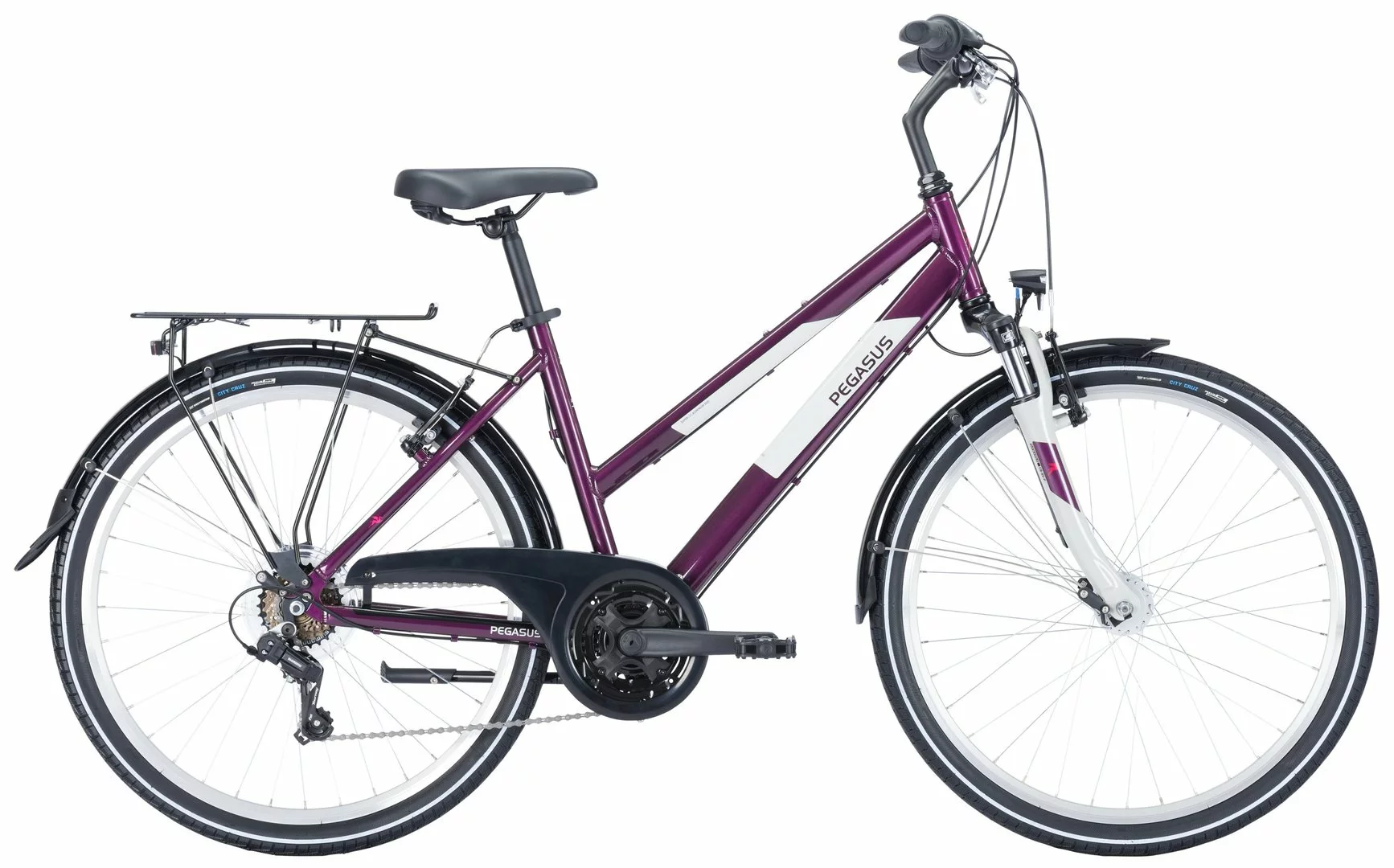 6061 Alurahmen mit Suntour CR-8V-P Federgabel, Shimano Tourney Kettenschaltung mit Revoshift Schalthebeln (Drehgriffe), STYX Alu Kurbeln, Alu V-Bremsen vorne und hinten, Alu-Hohlkammerfelgen, Vee Tire City Cruz Reifen (47-559), Downhill-Lenker, Kettenschutz, komplette Straßenausstattung mit Shimano Nabendynamo, Standrücklicht und 30-Lux LED-Lampe