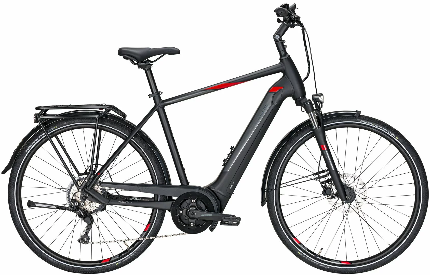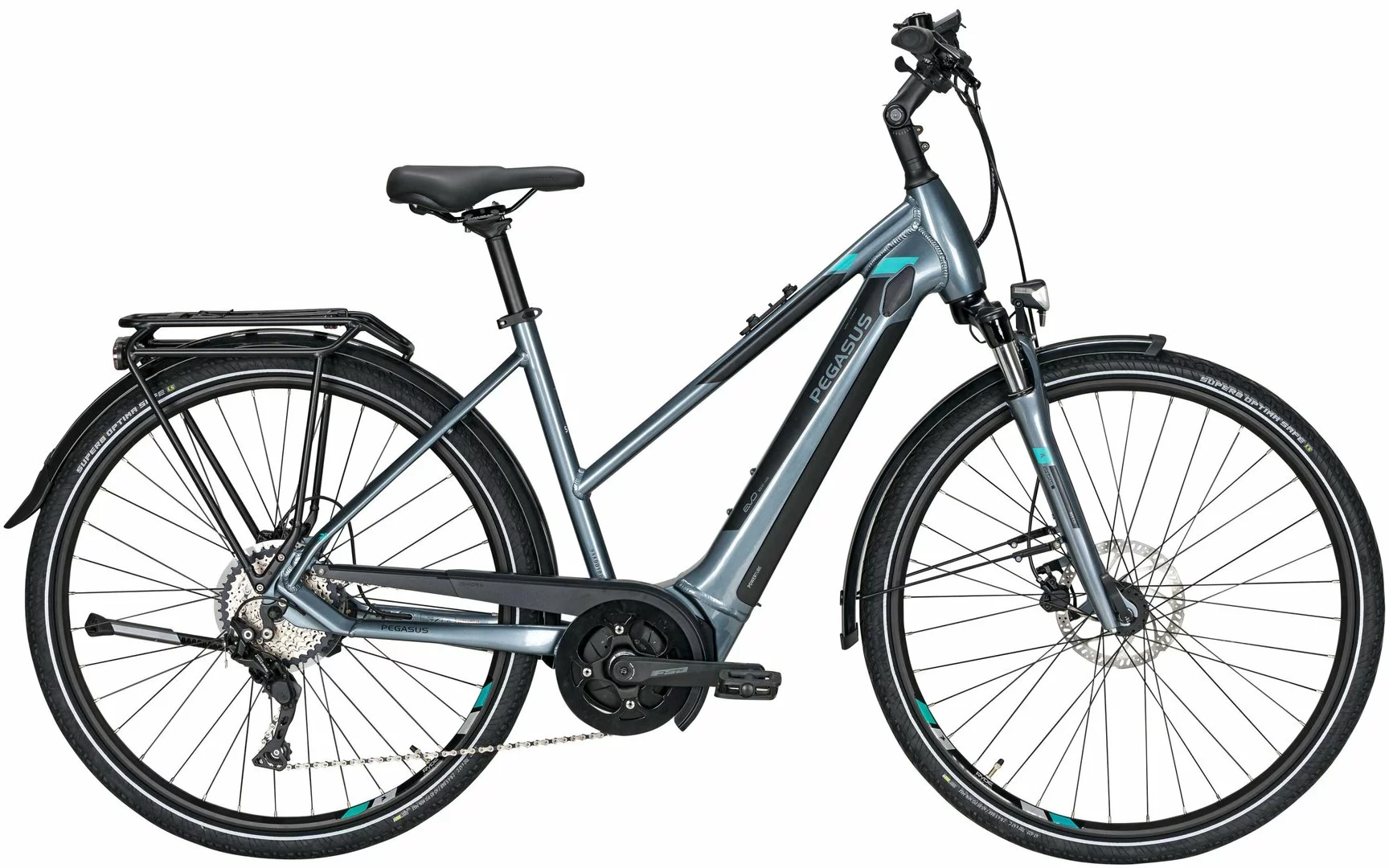 Beim Premio Evo 10 stehen Fahrkomfort und harmonische Formgebung im Mittelpunkt. Als vielseitiges Trekkingbike konzipiert, vereint es den angenehmen Charakter eines nachdrücklich anschiebenden Bosch-Motors mit dem hohen Komfort einer aufrechten Sitzposition, ergänzt durch die Stoßabsorption einer weich ansprechenden Federgabel. Der in drei Varianten verfügbare Rahmen ist dank innenliegendem Akku besonders glattflächig; eng ans hintere Schutzblech geschmiegt ist der solide Gepäckträger mit seinen schräg abfallenden Seitenteilen. Danke der gut erreichbaren Ladebuchse am Unterrohr lässt sich der mit 400, 500 oder 625 Wattstunden verfügbare Akku einfach mit Strom versorgen. Zum großen Übersetzungsumfang der 10-Gang-Kettenschaltung kommen kräftige Scheibenbremsen; rutschfeste Pedale und eine helle Lichtanlage bieten zusätzliche Sicherheit.