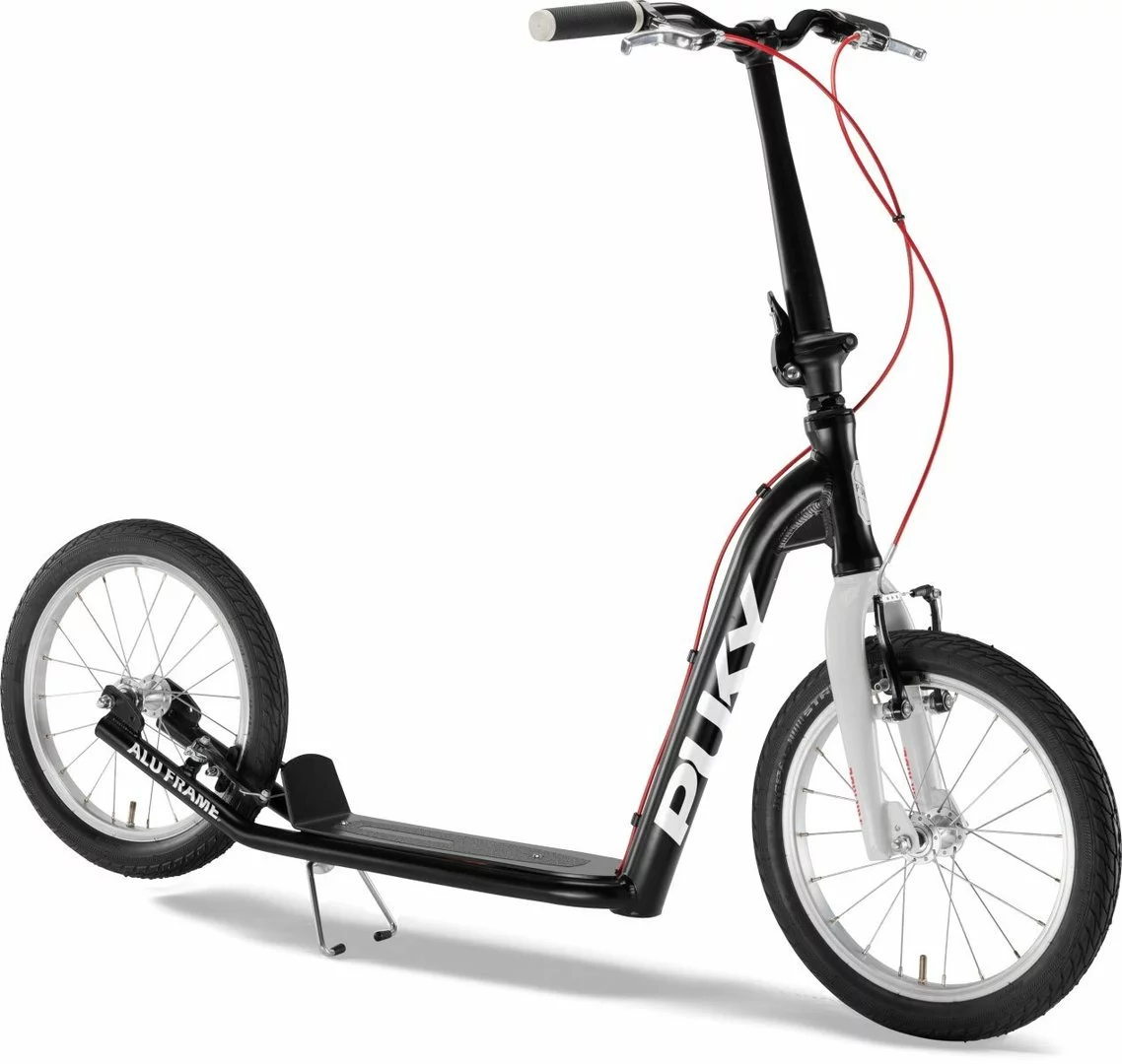 Wer flott und stylisch unterwegs sein möchte, kommt an PUKY JOKER nicht vorbei. Ob für einen kurzen Trip durch die Wohnsiedlung oder der Pendelweg zur Arbeit. Mit seinen 16″ Alu-Laufrädern liegt der PUKY JOKER gut auf der Straße und überwindet kleine Hindernisse spielend leicht. Für langanhaltende Laufruhe sorgen zudem die kugelgelagerten Speichenräder und die Lenkung. Für massig Grip hat Puky dem Scooter Dual-Density-Griffe sowie ein rutschfestes Trittbrett verpasst. Die griffigen V-Brakes vorne und hinten bringen den PUKY JOKER schnell zum stehen. Wie alle Puky-Modelle hat der Alu-Scooter eine stoßfeste Pulverbeschichtung vorzuweisen. Der PUKY JOKER wiegt dank leichtem Alurahmen nur 7,7 kg und kann durch den Klapp-Vorbau verkleinert werden. Damit Jung und Alt Spaß am cleveren Scooter haben, lässt sich der Lenker des PUKY JOKER in der Höhe verstellen.